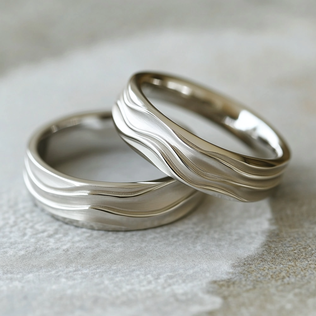 Beautiful. We can design complementary bands that honor both of your styles while creating visual harmony. They don't have to match exactly—they just need to feel like they belong together.